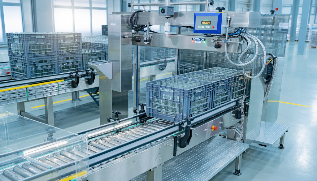 Der Vollinspektor überprüft jede Flasche auf allen relevanten Parametern – und das auf minimalem Platz. Ideal für kompakte Produktionslinien.